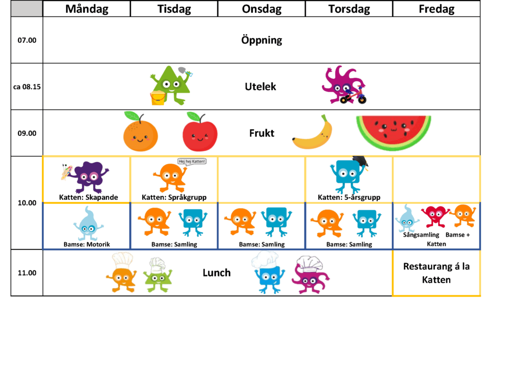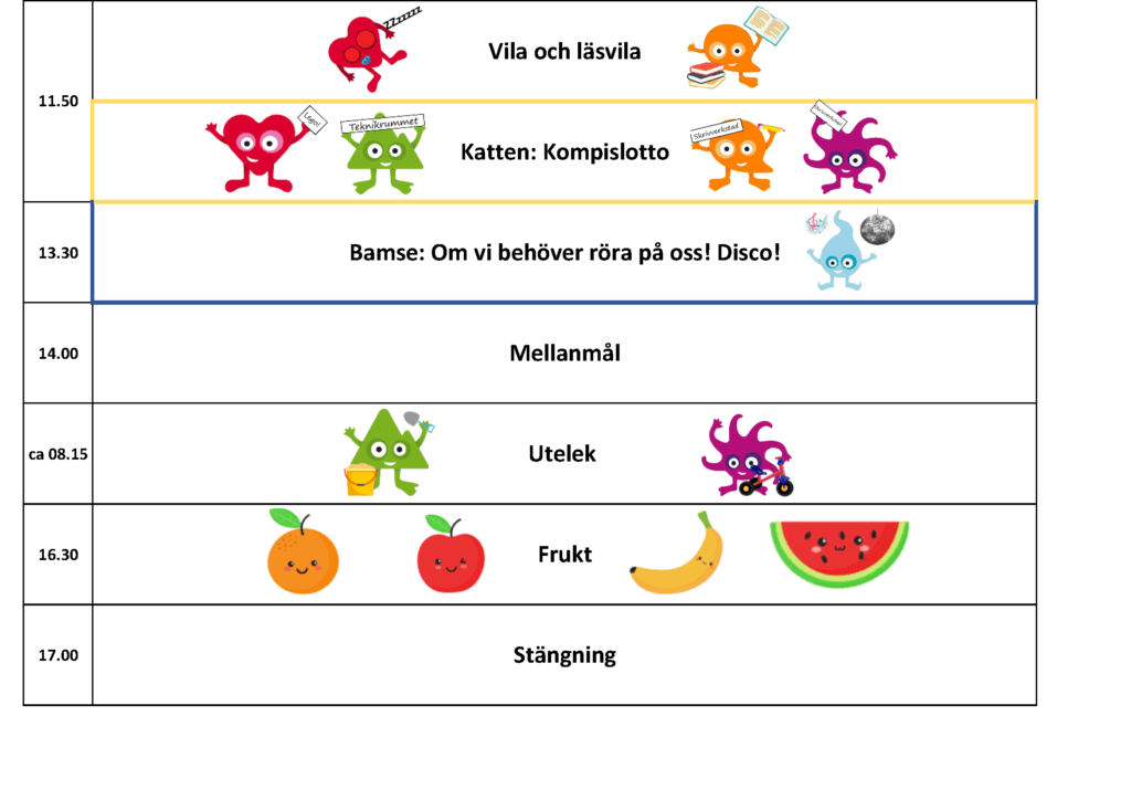 Här kan du kika på vårt veckoschema så att du kan få en bild av hur en dag hos oss på Filuren förskola kan se ut. Allt från öppning, utelek, fruktstund, vad våra olika grupper sysslar med på förmiddagen, när vi äter lunch i ”restaurang á la Vargen”, vila och läsvila, ”kompislotto” eller disco, mellanmål, utelek, fruktstund och stängning. Vill du veta mera så är du välkommen att kontakta oss, vi vill gärna berätta mer om verksamheten. Du kan också beställa mer information genom att fylla i formuläret nedan.